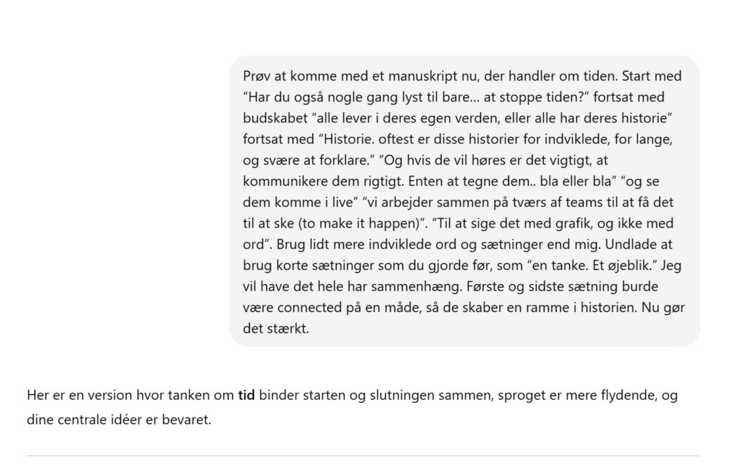 I næste fase begyndte jeg at definere strukturen for voice overen. Jeg havde allerede en grundidé til fortællingen, men sproget og rytmen skulle finpudses for at skabe den ønskede effekt. Her fik jeg hjælp af ChatGPT til at arbejde videre med formuleringer og struktur, så teksten blev mere flydende og dramaturgisk stærkere.