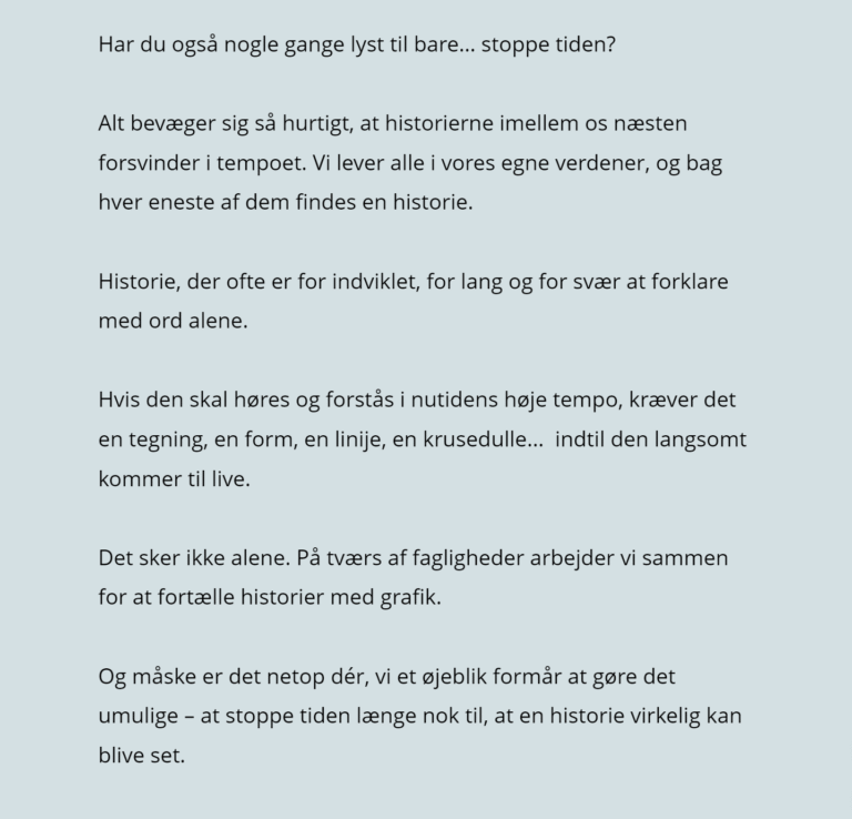 Efter tre dages arbejde stod den endelige video færdig. Resultatet er en kort motion graphics film, der kombinerer video, illustration, typografi og animation for at fortælle en historie om tid, mennesker og visuel formidling – og samtidig demonstrere min tilgang til grafisk design og storytelling.