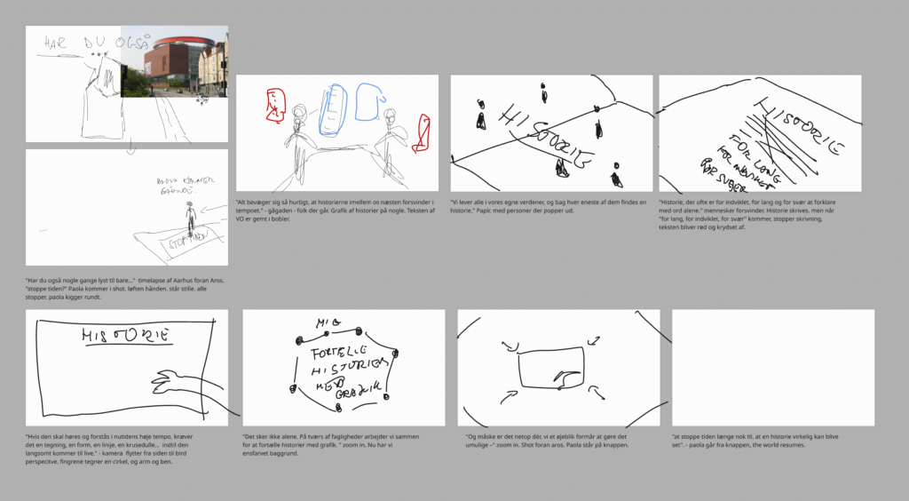 Da jeg arbejdede alene på projektet, var det vigtigste, at storyboardet gav mening for mig selv. Derfor kan nogle af noterne virke lidt abstrakte for andre – men de fungerede som effektive påmindelser om, hvad hvert enkelt shot skulle indeholde.