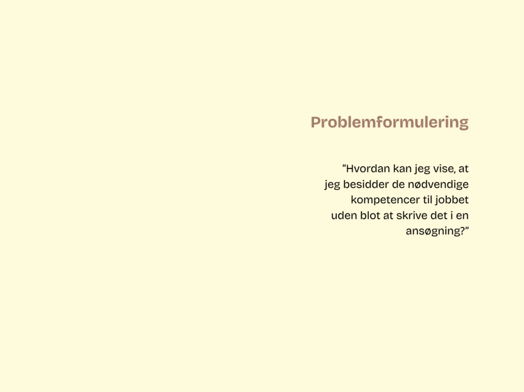 På baggrund af analysen formulerede jeg først en problemstilling og derefter en mere konkret problemformulering. Jeg ønskede at arbejde ud fra princippet show, not tell. Samtidig ville jeg skille mig ud fra de mere konventionelle ansøgningsvideoer, hvor man typisk sidder foran et kamera og fortæller om sig selv.