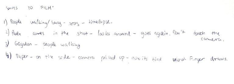 Allerede i denne fase begyndte temaet om tid at opstå som en central idé. I mine noter stod der blandt andet: “noget om tid” og “stykke papir”. Begge dele udviklede sig senere til konkrete elementer i den færdige video.