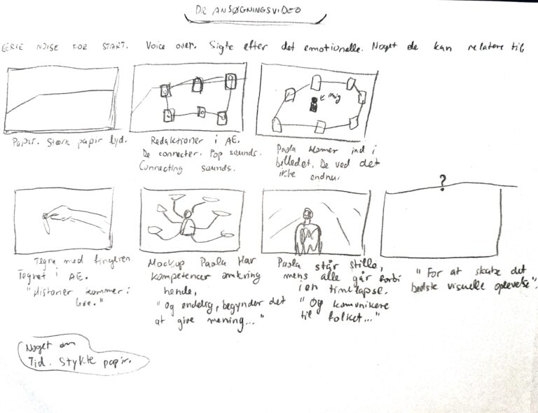 Hele processen tog tre dage fra idé til færdigt produkt. På siden her kan du følge de vigtigste 12 trin i udviklingen – fra den første analyse af jobopslaget til storyboard, manuskript, optagelser og den endelige produktion i After Effects. Undervejs vil man også kunne genkende flere elementer fra de tidlige idéer i den færdige video. Allerede i de første skitser begyndte centrale temaer og visuelle greb at tage form, som senere blev udviklet og forfinet i det endelige resultat.